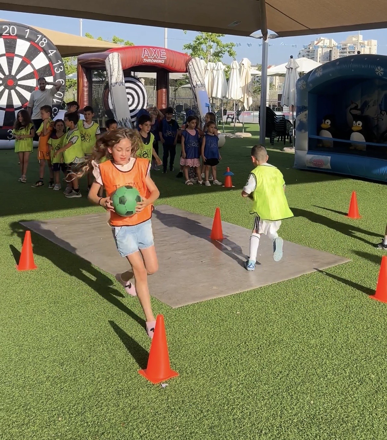 הפעילות כוללת מסלולי מכשולים, סללום, סולמות זריזות, משוכות, תרגול בעיטות ומסירות ומשחקי פנדלים – כולם משתתפים, כולם פעילים, כולל הבנות שנהנות ולוקחות חלק מלא לאורך כל ההפעלה.