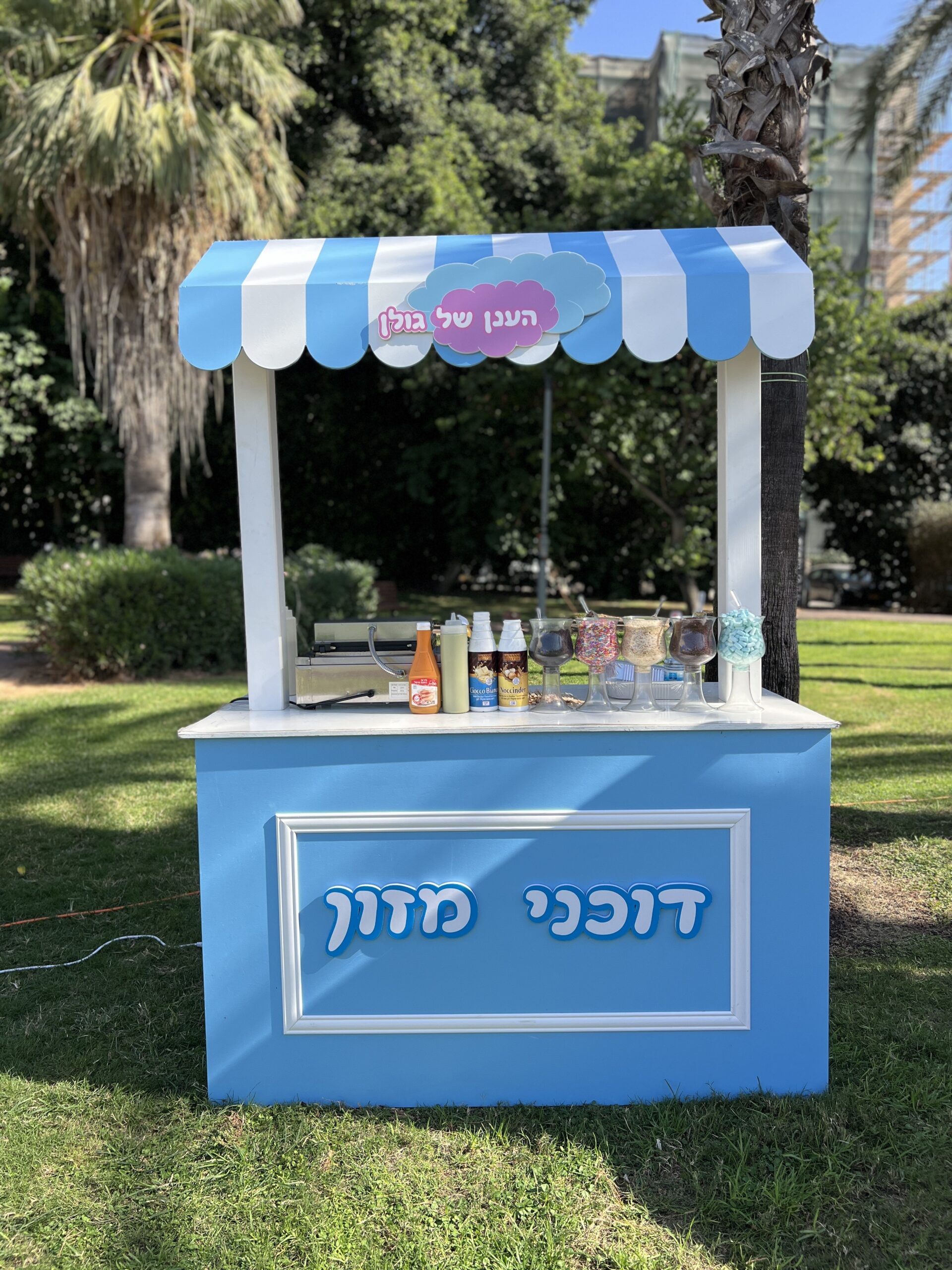 - דוכן מתנפח בקונספט וממנו יוצאים דוכני מזון טעימים לבחירה- פופקרן, וופל בלגי, נקניקייה בלחמניה, סוכר מתוק ועוד..